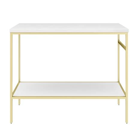 The smart space-saving Arezzo 1010mm wide stone resin gloss white worktop with brushed brass washstand for use counter top basins, brings minimalist luxury to your space with its striking brushed brass lines and cool, gloss white components. The brushed brass framed washstand has an open shelf for storing and displaying your favourite cosmetics, as well as a convenient integrated towel rail. Complete the look with one of our stylish counter top basins, brushed brass basin taps and exposed bottle traps (not included).