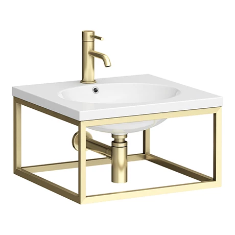 The smart and space-saving Arezzo 500mm wall mounted basin comes complete with a supporting brushed brass steel towel rail frame, perfect for creating a stunning, fashionable and chic bathroom interior.