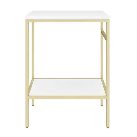 The smart space-saving Arezzo 610mm wide stone resin gloss white worktop with brushed brass washstand for use counter top basins, brings minimalist luxury to your space with its striking brushed brass lines and cool, gloss white components. The brushed brass framed washstand has an open shelf for storing and displaying your favourite cosmetics, as well as a convenient integrated towel rail. Complete the look with one of our stylish counter top basins, brushed brass basin taps and exposed bottle traps (not included).