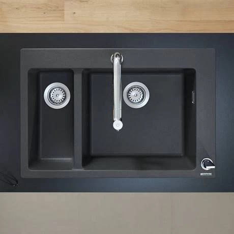 This complete kitchen sink and tap combination bundle from hansgrohe consists of a 1.5 bowl black granite sink, 2-hole mixer tap with pull-out spray and a manual waste kit. The sink is made from natural SilicaTec granite in black finish. The stylish chrome mixer tap features a pull out spray head which is lockable and returns automatically by pressing the spray diverter. The sBox makes for extra convenience, enabling your tasks to run smoothly. The hose can be pulled out and retracted smoothly in its box preventing it jamming up or being damaged. The hose weight is quietly routed, and is safe inside the box from any obstacles that stop it from functioning.