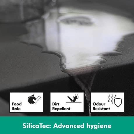 An impressive composite of quartz and acrylic, SilicaTec Granite is a high-grade material created by hansgrohe for their high-quality kitchen sinks. Sturdy, non-porous, and smooth to the touch, SilicaTec sinks benefit from being able to resist food stains, scratches, knocks, and dents. The smooth surface also prevents both water and dirt from sticking.