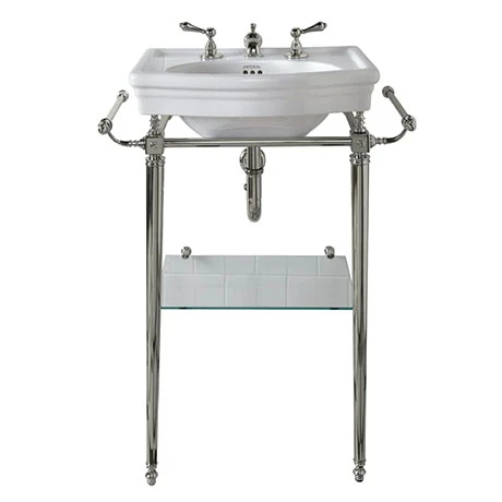 Imperial Etoile ceramic ware is a collection with exceptional presence and strength of character. This 530mm Small Basin and Polished Nickel Basin Stand features a Victorian inspired design with rounded corners to provide a smooth and subtle variation on a classic look. The luxury polished nickel basin stand features a glass shelf and a towel rail either side offering practical storage. All Imperial ceramic ware is made in Britain from clay sourced in Cheshire.