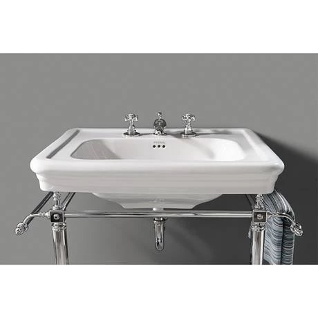 Imperial Etoile ceramic ware is a collection with exceptional presence and strength of character. This 700mm Large Basin and Antique Gold Basin Stand features a Victorian inspired design with rounded corners to provide a smooth and subtle variation on a classic look. The luxury Antique Gold basin stand features a glass shelf and a towel rail either side offering practical storage. All Imperial ceramic ware is made in Britain from clay sourced in Cheshire.