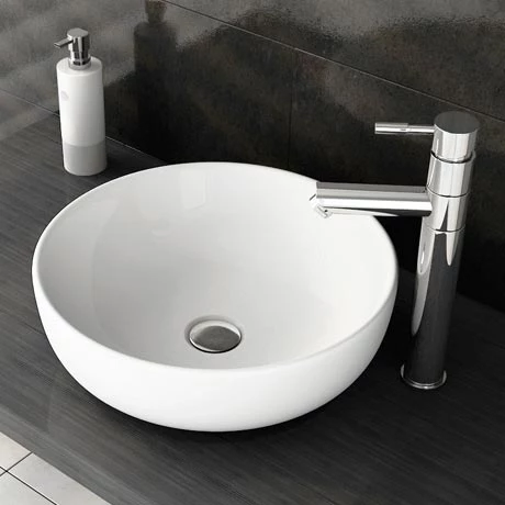 The stylish 400mm diameter round counter top basin bowl with a matching Swift round high rise mono basin mixer, designed to be mounted onto a worktop console or piece of vanity furniture. The basin comes with no tap holes.