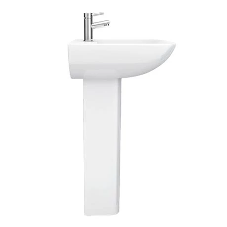 The Venice Modern Short Projection Basin & Pedestal combines a traditional silhouette with modern details for timeless appeal in your bathroom. Its modest width of just 550mm makes this short projection basin a good fit for smaller bathrooms and en-suites. It’s also made from high grade ceramic – a material known for its hardness, strength and heat resistance. Finished in a smooth white gloss, this Venice basin is easy to pair with other fixtures such as a Milan Concealed Shower Package with Head and Handset. The sink’s handy predrilled hole will help make installation nice and simple too.
